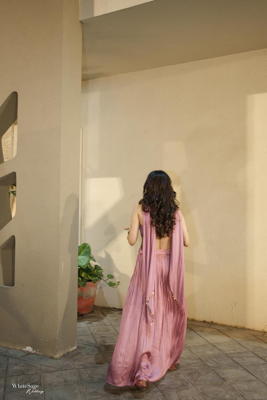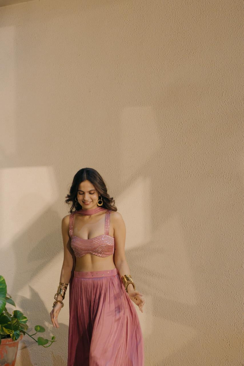 A festive set crafted for effortless elegance, featuring a delicately embellished blouse adorned with intricate kat-dana and tikki detailing. Paired with a flowyskirt highlighted by subtle coin work, the ensemble blends modern silhouettes with traditional craftsmanship, perfect for the wedding celebrations.