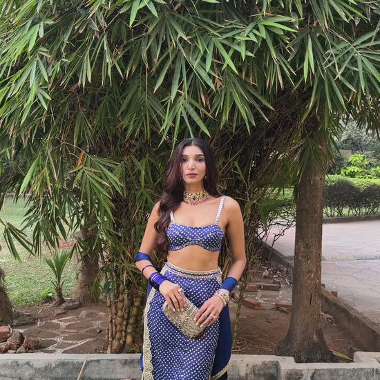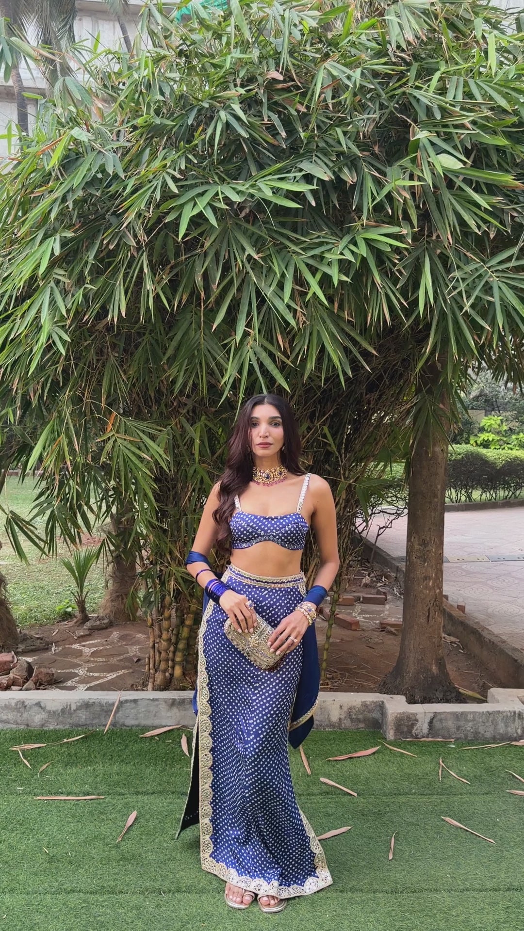 A graceful bandhani co-ord set crafted in rich hues, featuring a delicately hand-worked blouse adorned with handwork detailing that adds a refined festive charm. The look is elevated with elegant mirror work on the sleeves, bringing a subtle shimmer and traditional allure. This set is your perfect option for an indo-western fit.