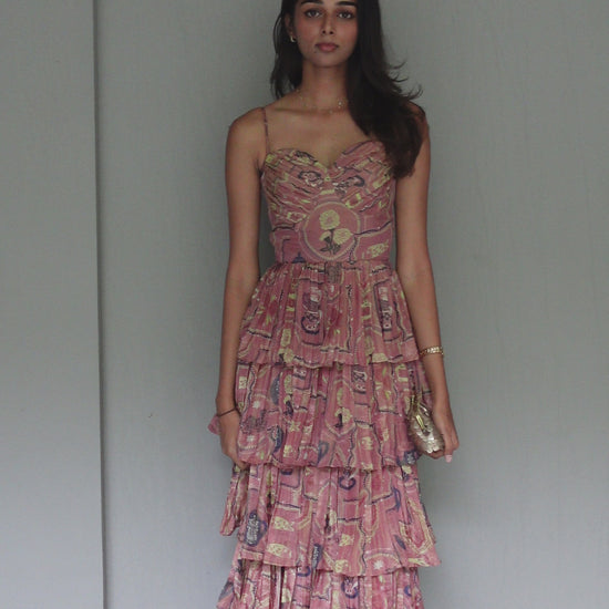 A five-tier dress featuring a sweetheart neckline and spaghetti straps.