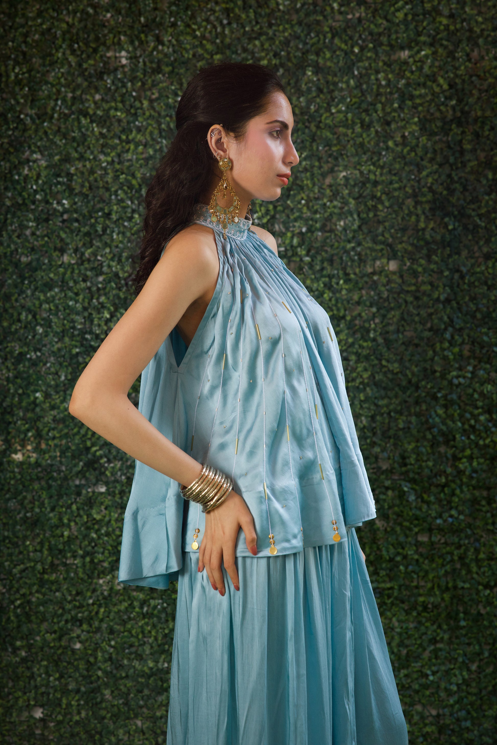 A T-neck flowy top with anchor stitching and handwork detailing along the neckline.